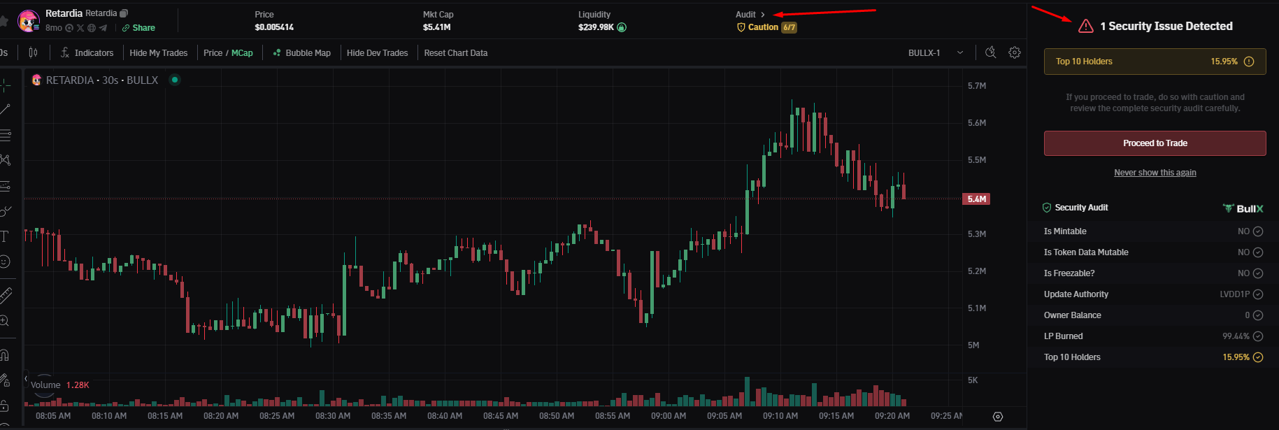 Note: Even though there’s 1 security issue detected, “Top 10 Holders” shouldn’t be higher than 20%-25% (depending on the coin), so this one looks good.