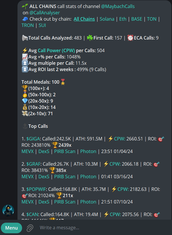 For example, GIGA was called by the “Maybach Calls” channel, which saw a 2439x return. You can click on their channel to see the original call and check their past performance.