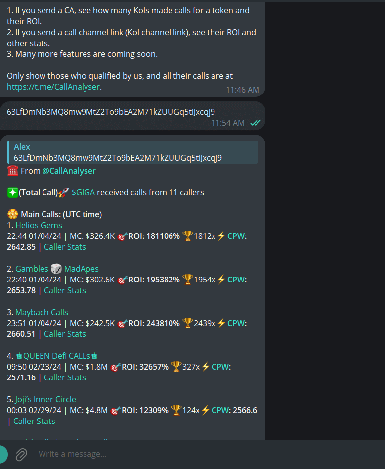 2. Use CallAnalyserBot: Open Telegram and search for “CallAnalyserBot.” Paste the contract address of the meme coin into the bot, and hit enter. The bot will then show you a list of Telegram channels that called the coin early.