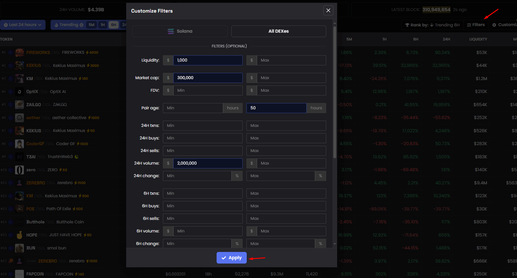 - Set Filters on DEX Screener: