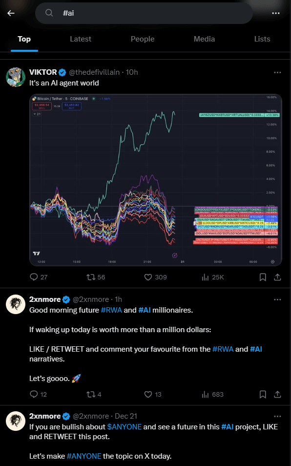 - Search hashtags like #AI, #memecoin, or specific keywords like “Solana meme coins.”